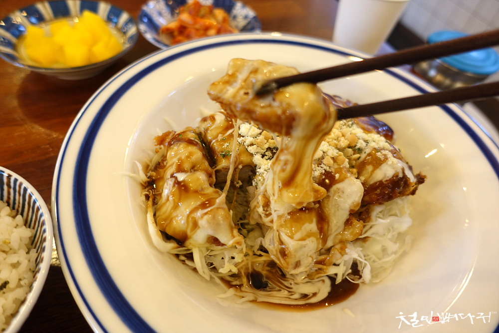 치즈를 돈까스 겉에 올리고, 소스를 뿌려서 나옵니다.