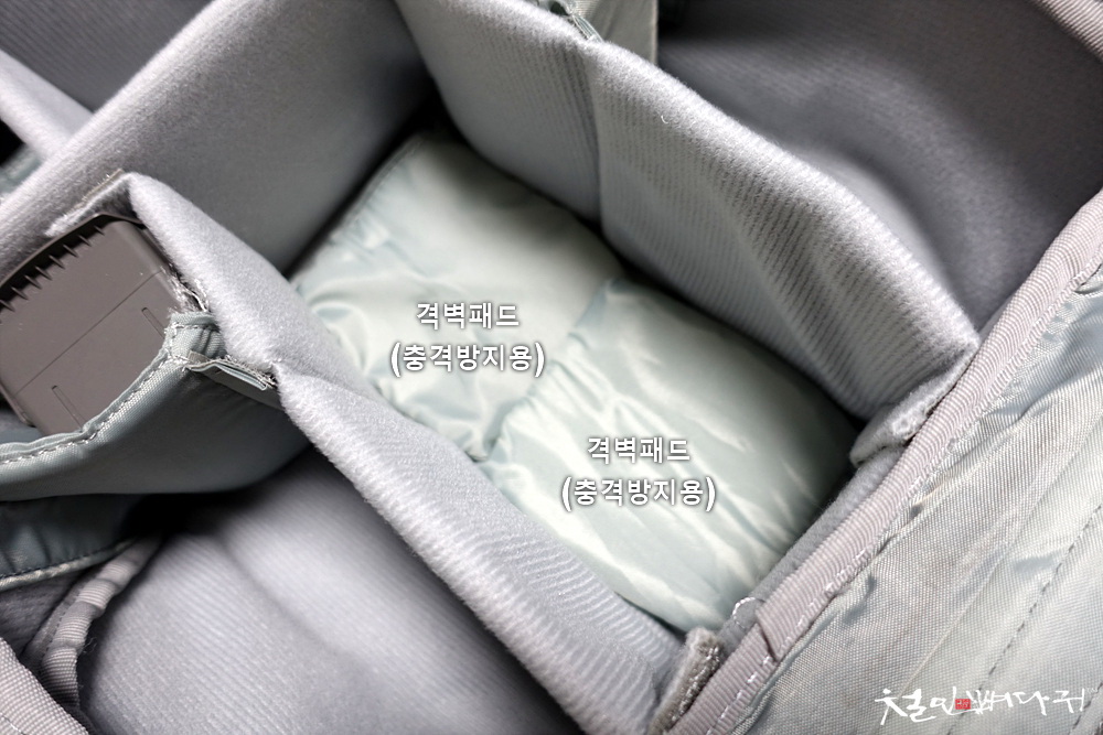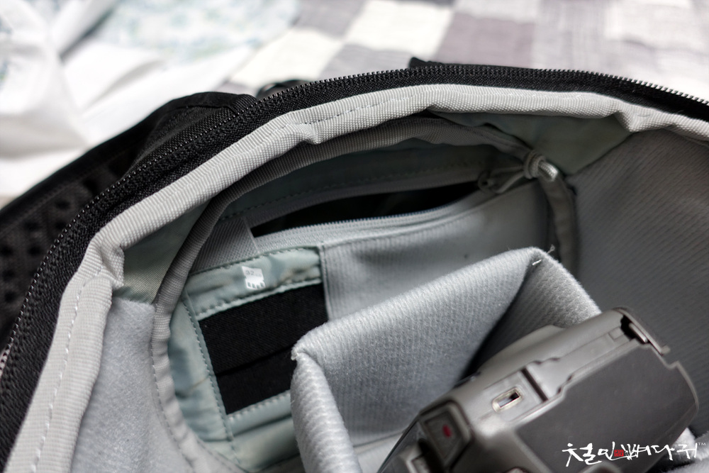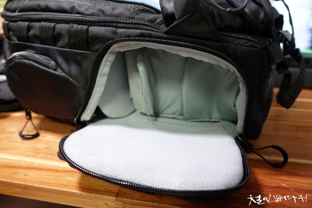 어깨끈이 있는 쪽의 등판을 열면 카메라가방으로 사용할 수 있는 메인 공간이 나옵니다.