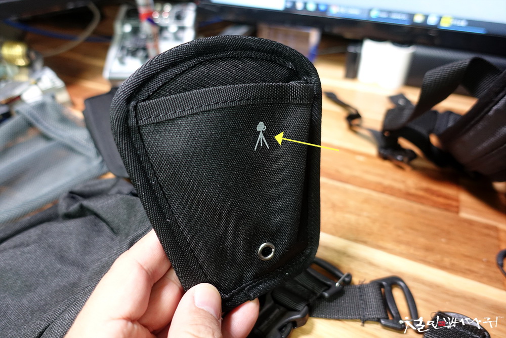 삼각대 그림이 있는 파우치는 삼각대나 스틱 같은 긴 장비들을 가방에 고정할 때,
