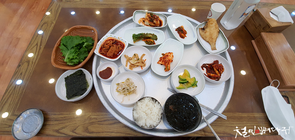 모든 반찬이 쟁반에 펼쳐진 상태로 자리가 없어서 1개의 반찬은 쟁반 밖으로 밀려났네요.