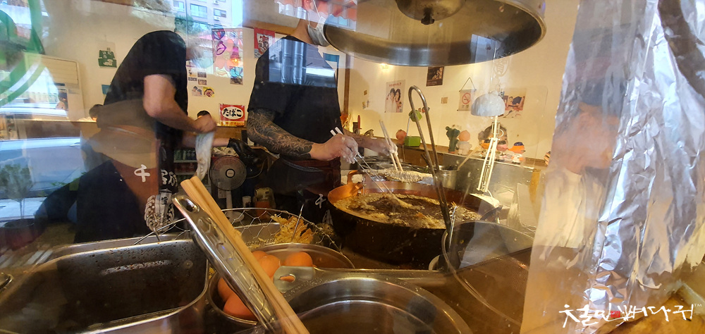 내가 앉은자리에서 튀김을 만드는 것을 유리 너머로 볼 수 있었습니다.