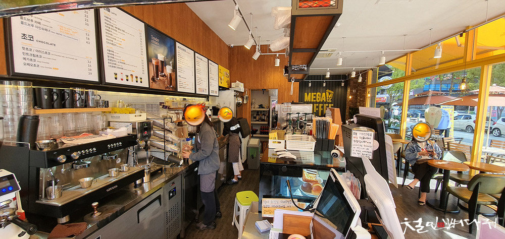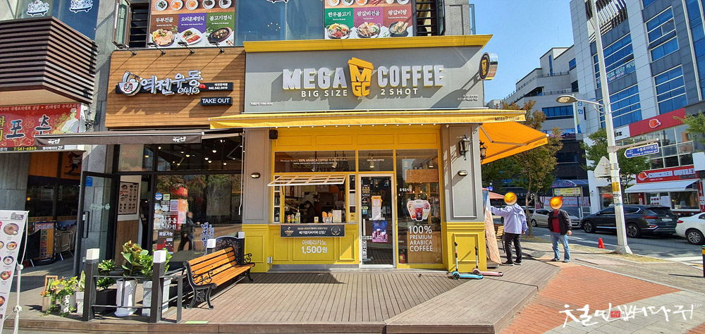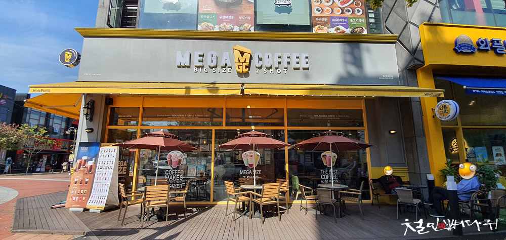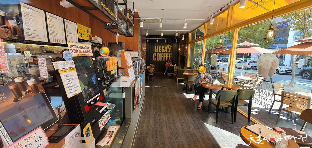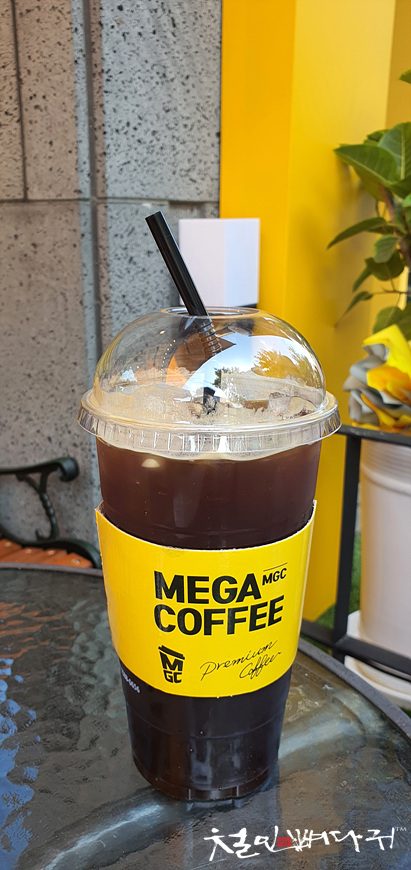 메가커피 밖에 있는 테이블에 자리를 잡았습니다.