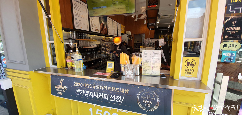 메가커피는 노란색 바탕의 인테리어로 산뜻했고, 이쁘게 보입니다.