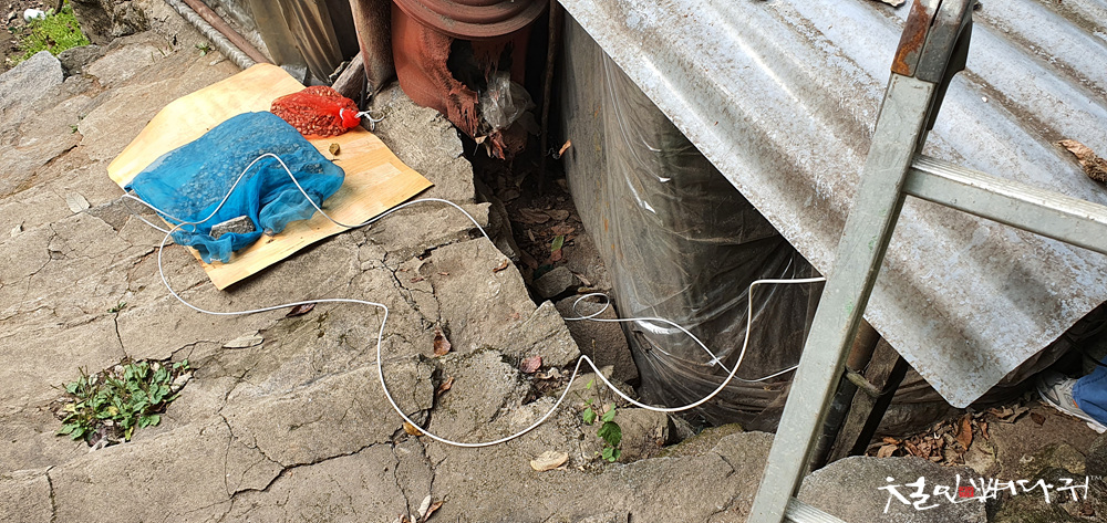 사다리 놓고 조심조심 올라가서 철사로 잘 묶어서 고정해주었습니다.