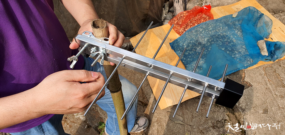 대나무에 안테나를 고정해주고,