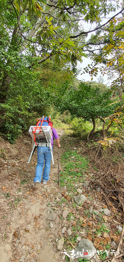 친구는 지게 지고, 무거운 짐을 메고 올라갔고, 나는 비교적 가벼운 짐을 들고 올라갔습니다.