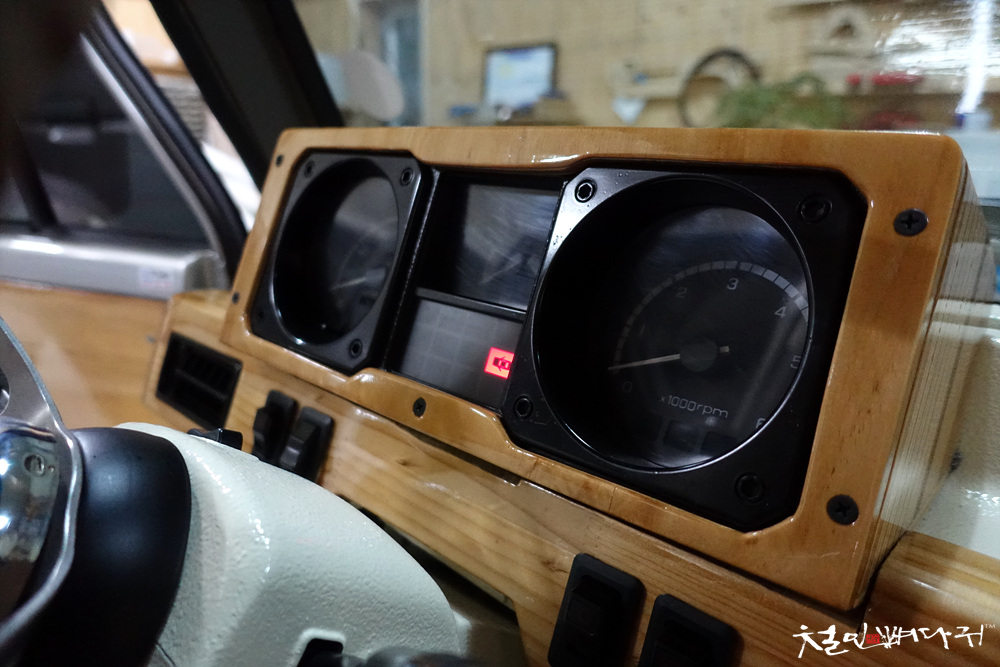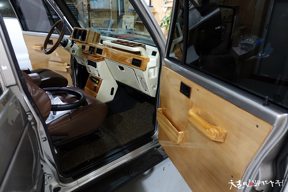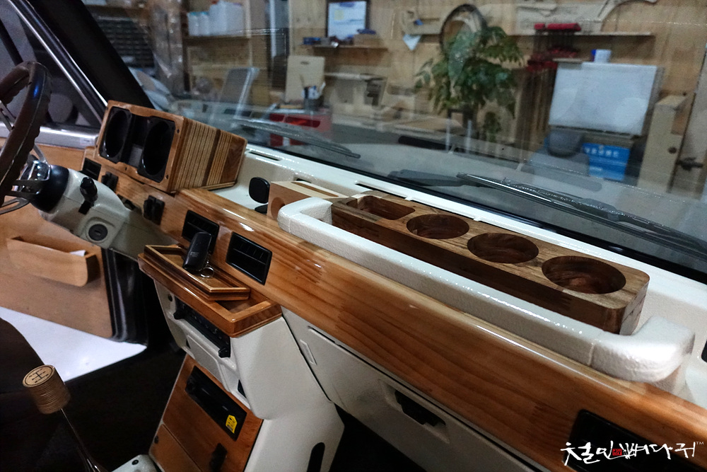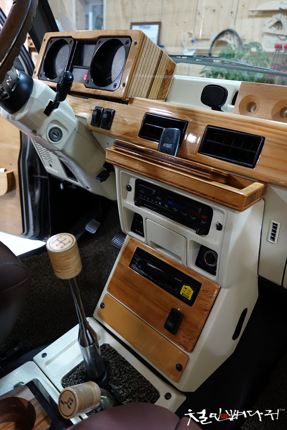 운전석의 대시보드까지 원목으로 재구성되어 있는 상태입니다.