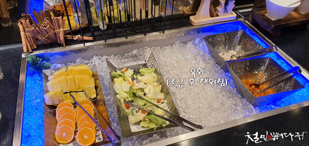 과일, 샐러드, 연근, 쫄면(?) 등이 있는 곳에 조금 후 채워진 육회도 있었습니다.