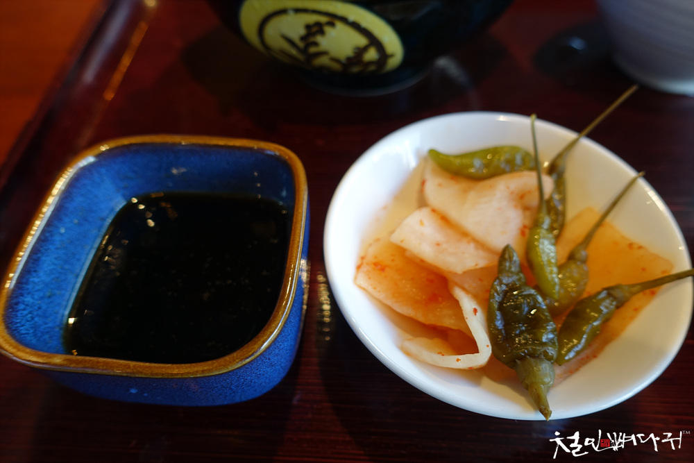 튀김을 찍어먹을 간장소스와 반찬.
