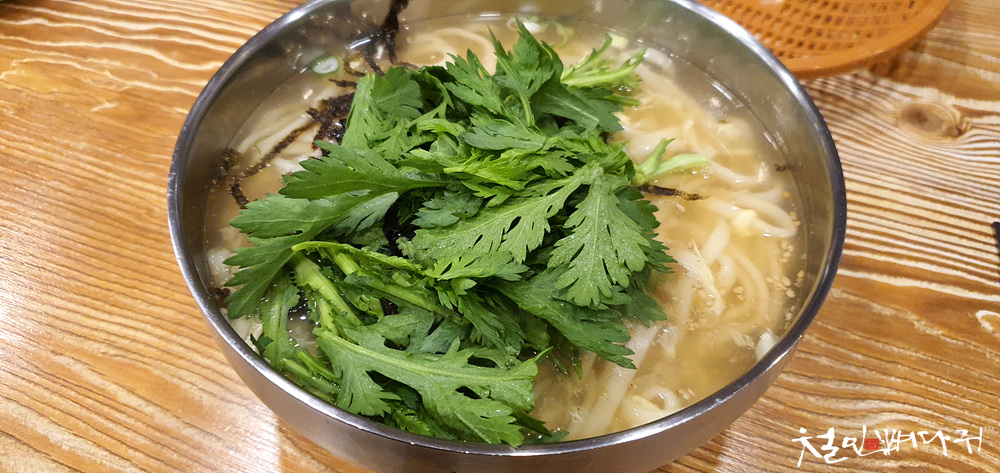 얼큰이칼국수와 하얀칼국수에 쑥갓을 손으로 대충 뜯어서 넣어주고 먹습니다.