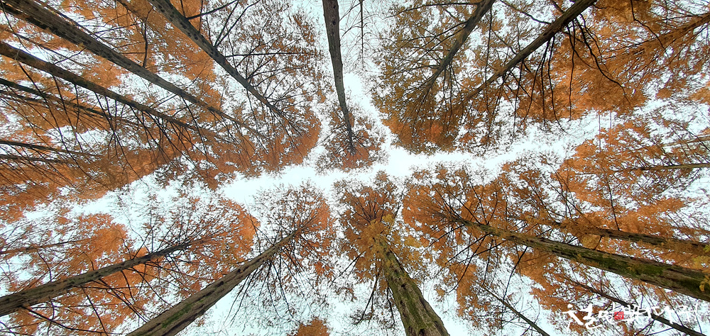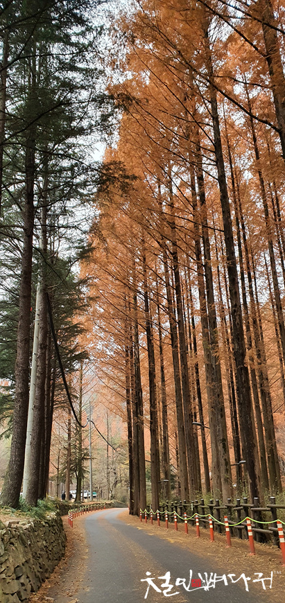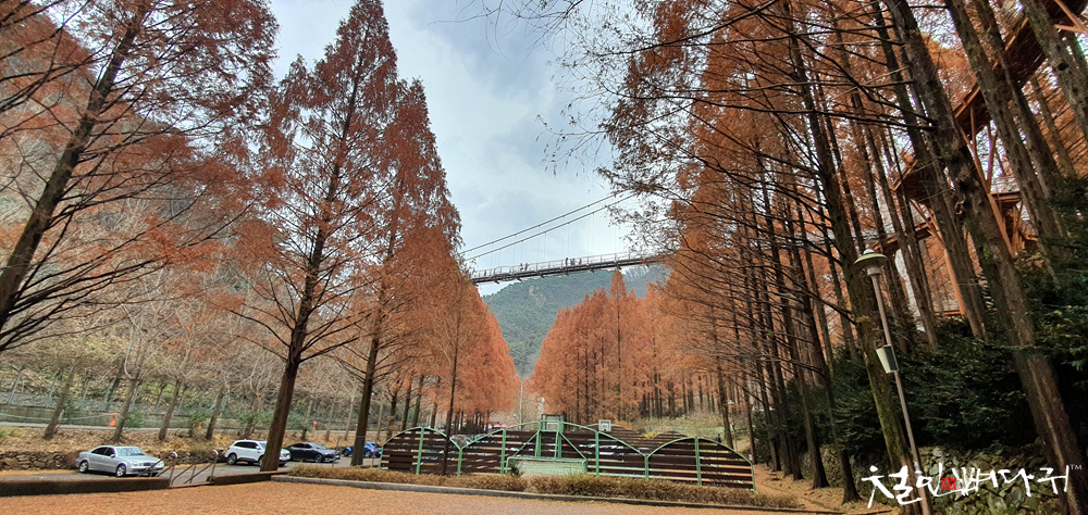 메타세쿼이아 나무들 사이로 높게 이어진 스카이웨이가 멋지게 가을 속에 동화되어 있습니다.