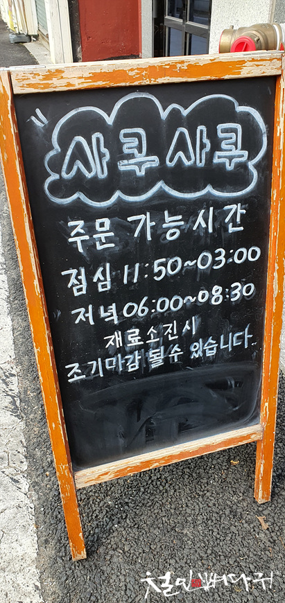 밖에서 볼 수 있는 입간판에는 대표메뉴들과 주문시간, 브레이크타임.