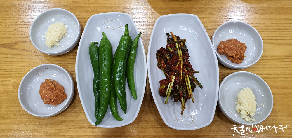 기본 반찬은 고추이고, 부추김치는 반찬이라기보다 다진 양념 양념으로 사용됩니다.