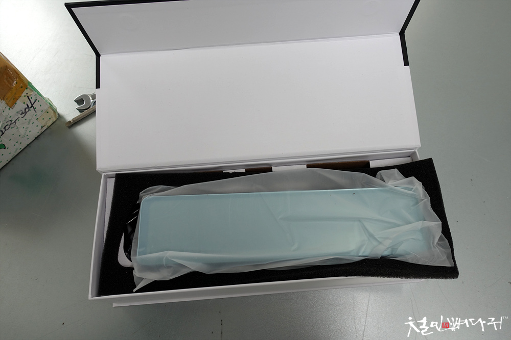 단단한 박스 안에 잘 쌓여있는 룸미러모니터 본체가 있습니다.
