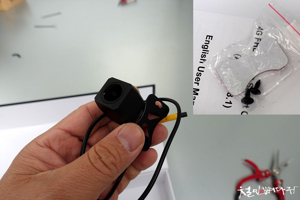방수되는 후방카메라와 양면테이프, 나사가 있고,