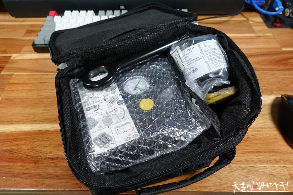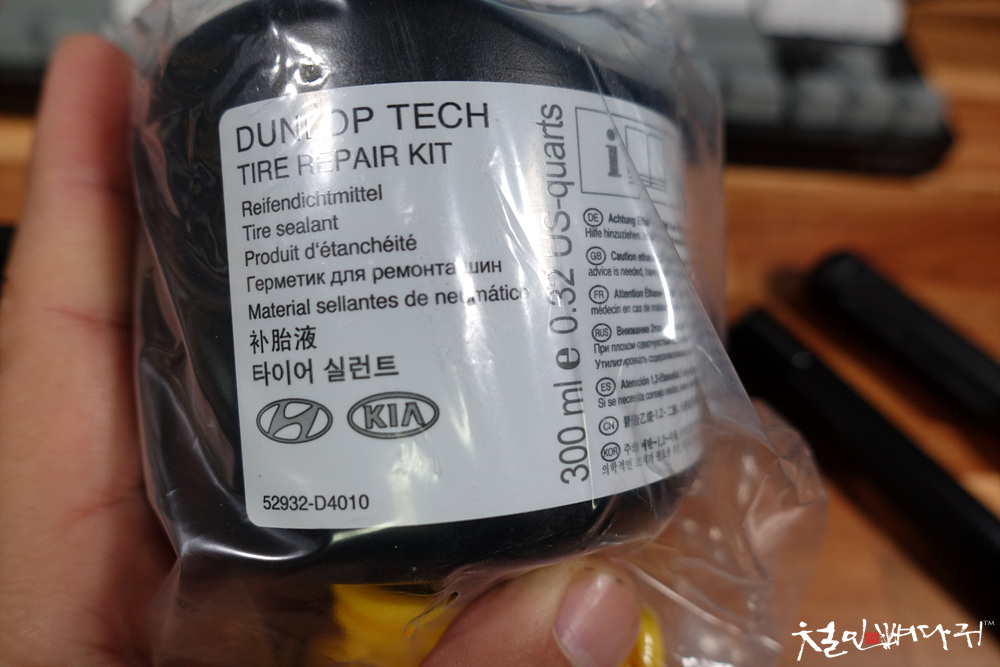 타이어를 뺀 트렁크 공간에 타이어 대신 넣어주는 구성품으로 타이어수리키트가 있는데,