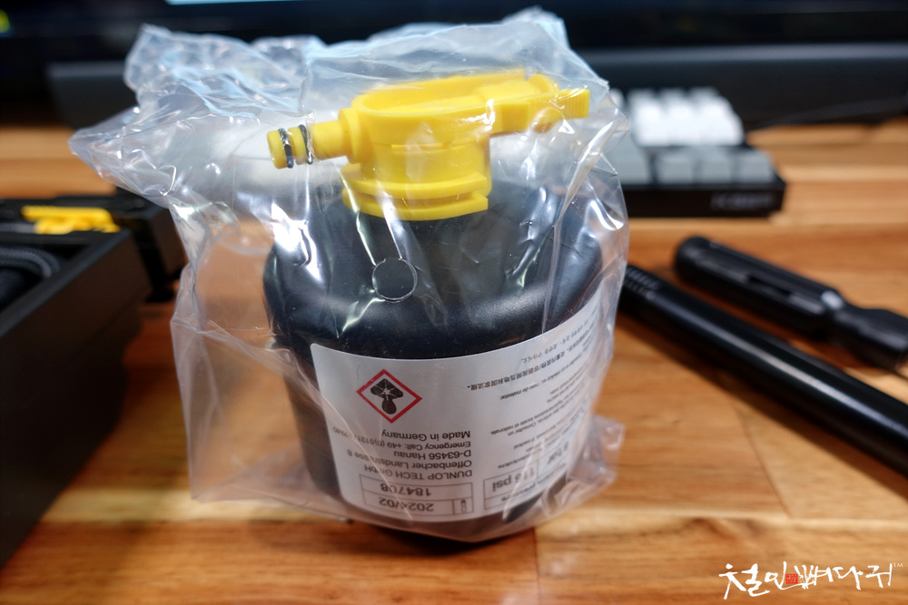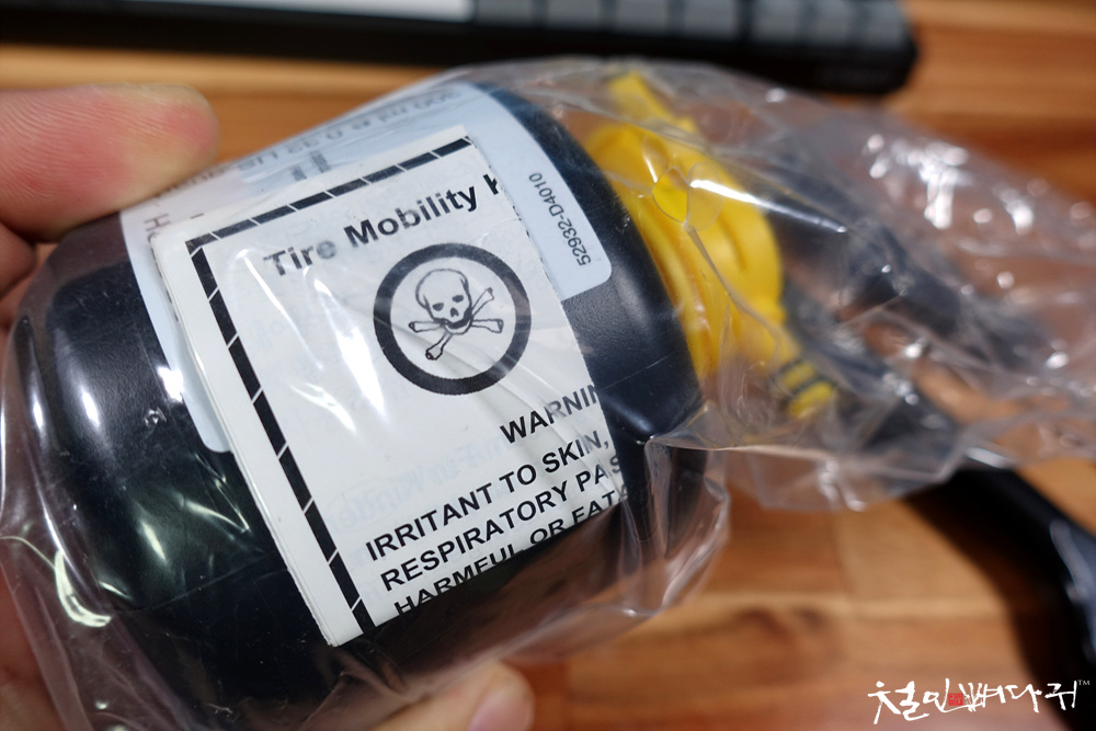 기아자동차 K7 트렁크에 스페어타이어 대신 들어있는 타이어 수리 키트입니다.