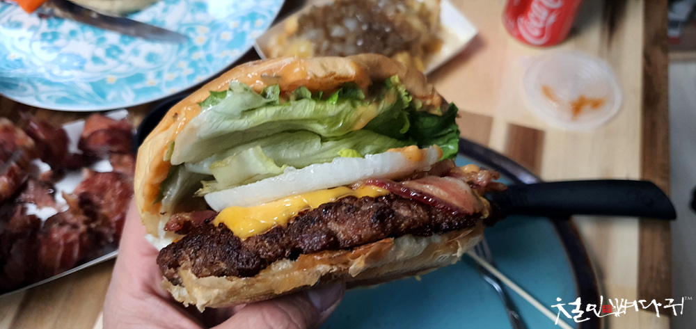 집에서 늦은 점심을 수제버거로 먹었습니다.