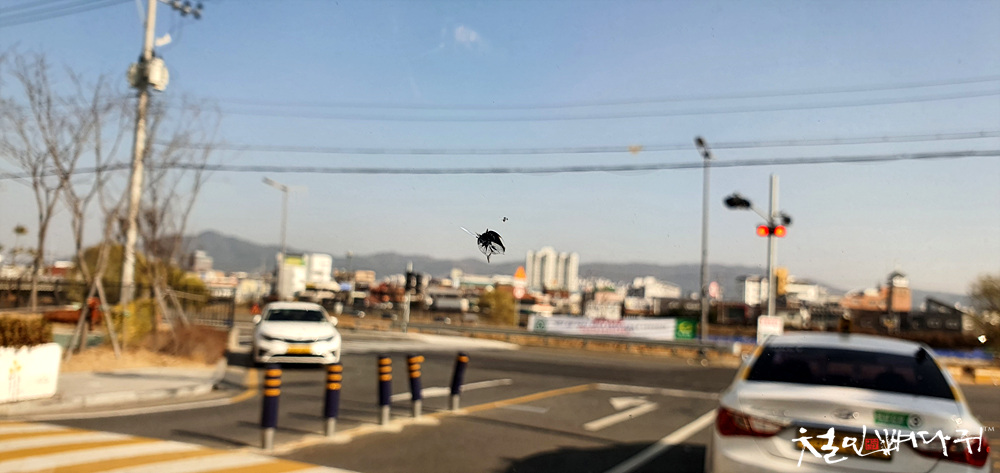 돌빵을 맞고, 운이 좋지 않으면 차량 앞유리는 겹유리 이기 때문에 임의 방향으로 금이갈 수 있습니다.