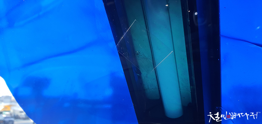 손으로 쓰다듬어 보면, 유리가 돌빵이 생겨서 파인 흔적을 느낄 수 있습니다.