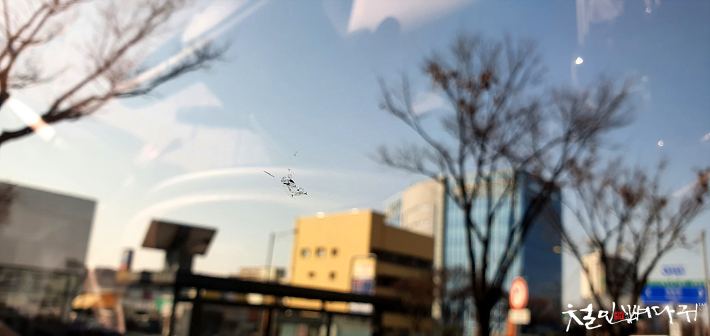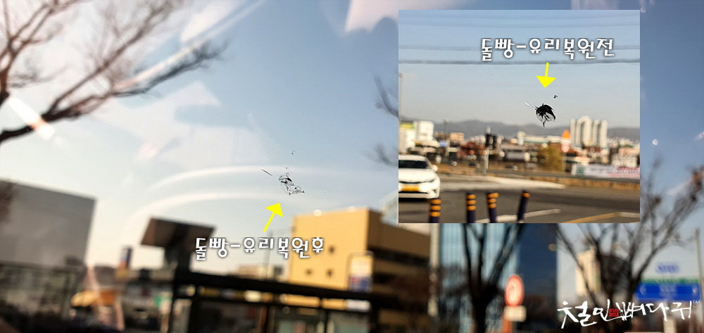 차량 안쪽에서 밖으로 보이는 상태의 돌빵을 보수했는데, 흔적은 남아있습니다.