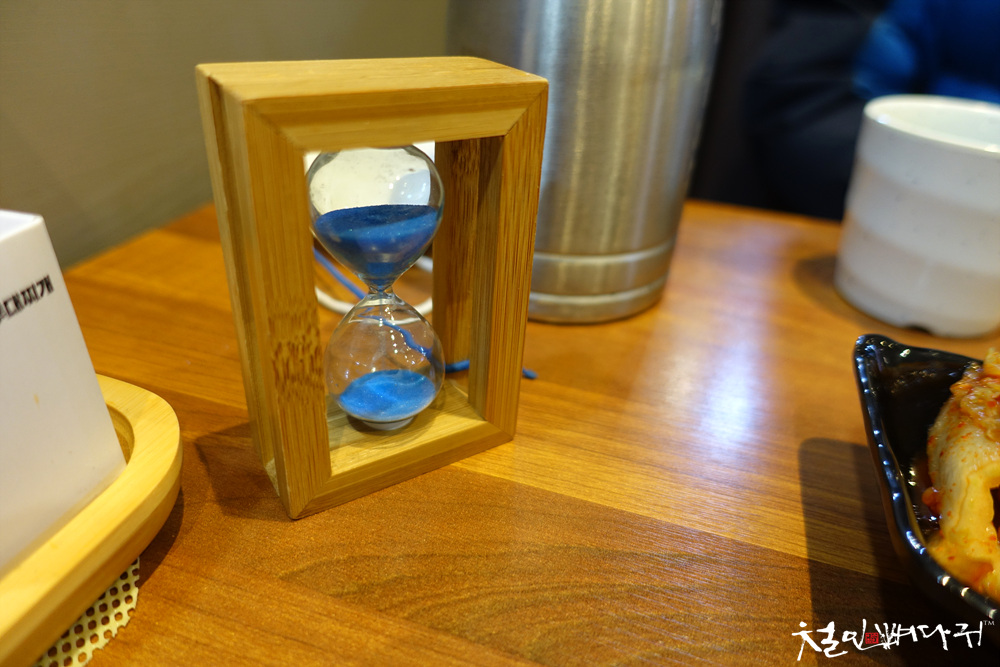 테이블에 있는 모래시계를 뒤집어서 모래시계가 다 될 때까지 기다려서 먹으면 됩니다.