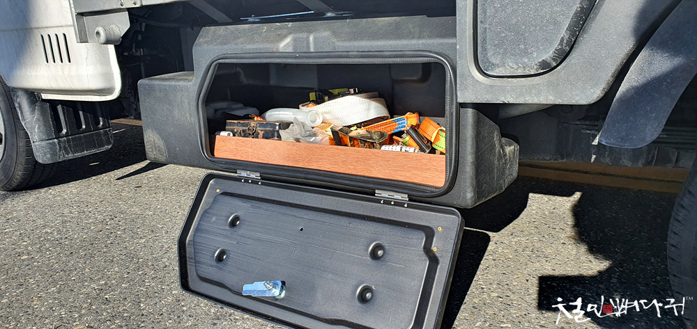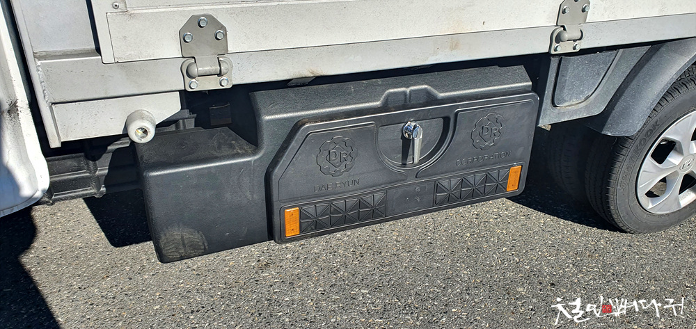 포터2 윙바디 탑차의 측면 하단 공간에 공구통을 설치했습니다.