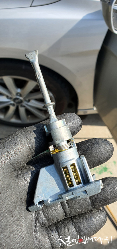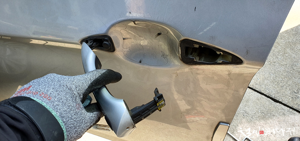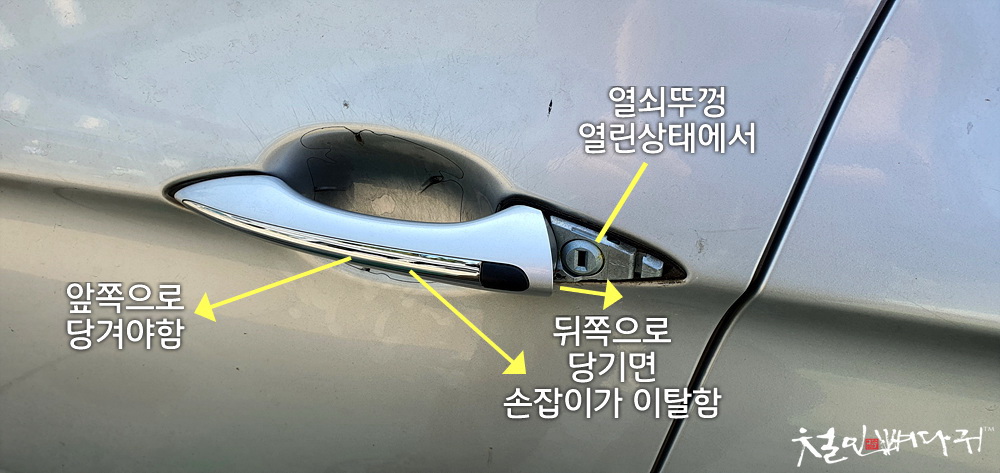 손잡이가 열쇠 덮개 쪽으로 밀려서 내부의 걸려야 하는 부분이 이탈을 하면서