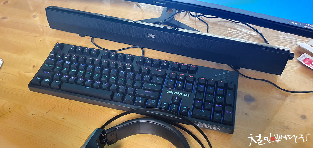 한성 32인치 커브드 게이밍모니터와 사운드바를 연결해 주었습니다.
