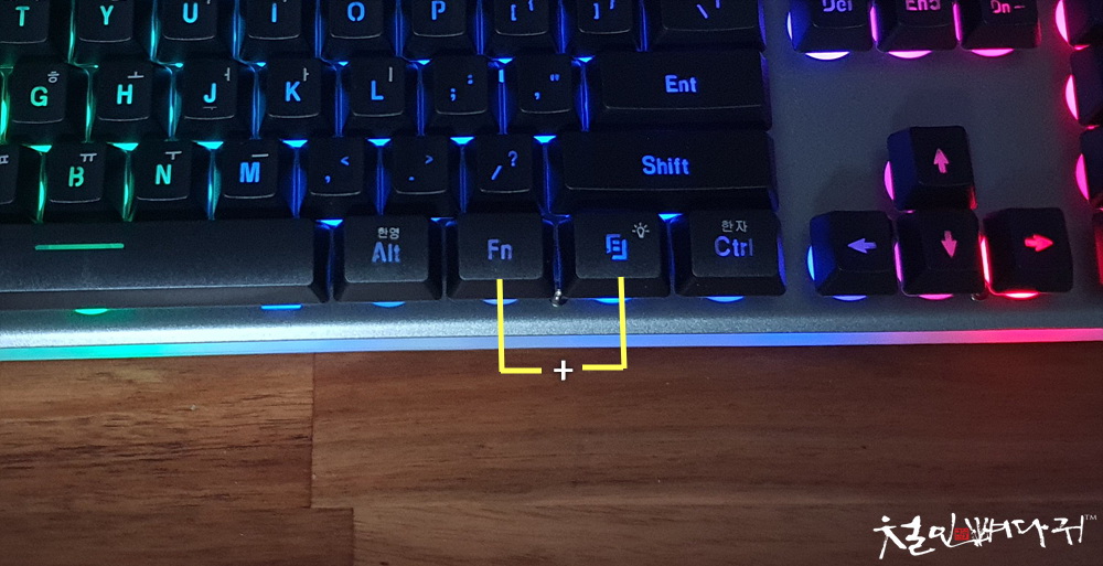 LED 빛을 제어하는 FN+조명버튼이 있는데, LED빛 ON 상태 유지와 천천히 꺼졌다가 켜지는 것을 반복하는