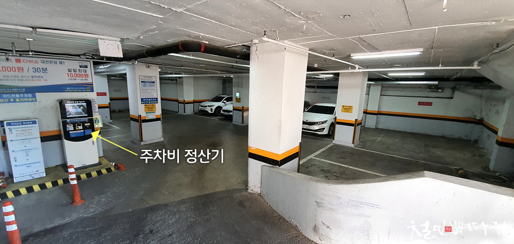 주차장의 정산기에서 차량번호 입력후, 주차권을 사용하거나, 현금/카드 결제를 하고,