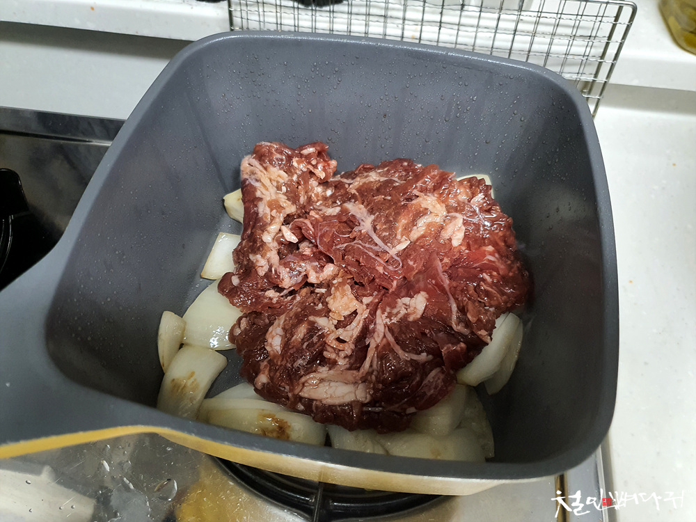 그리고, 소불고기용 고기를 넣고 볶아줍니다.