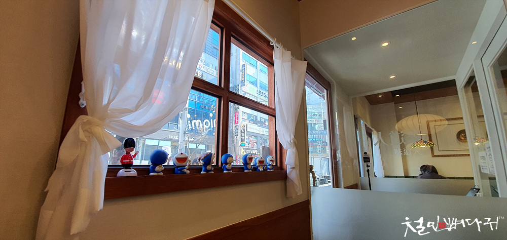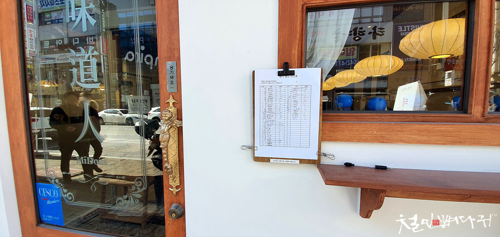 식당 입구는 문이 2개로 되어 있고, 발열체크, 손소독, 명부작성 같은 작업을 하고 입장할 수 있습니다.
