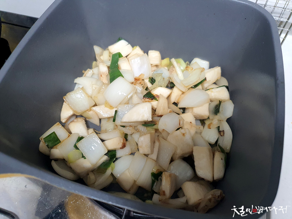 양송이버섯도 잘라서 추가로 넣고 달달달 볶아줍니다.