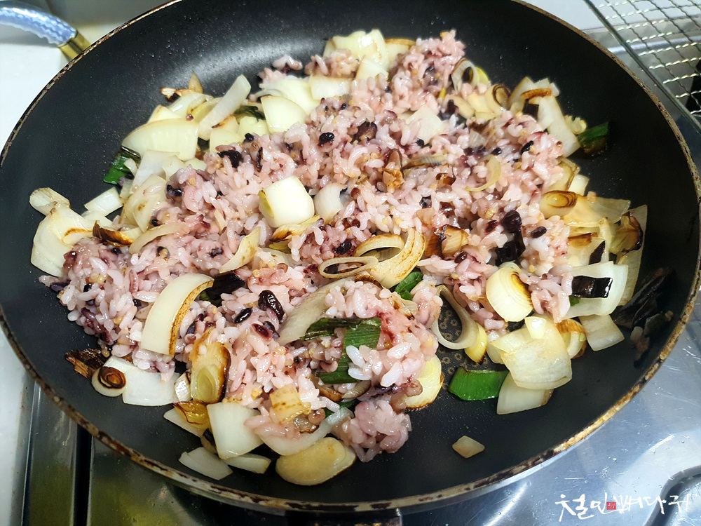 즉석 오곡밥을 넣어주고, 먼저 볶아준 파, 양파와 같이 볶아줍니다.