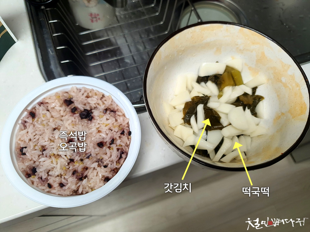 즉석밥의 오곡밥을 전자렌지에 1분정도 데워주고,
