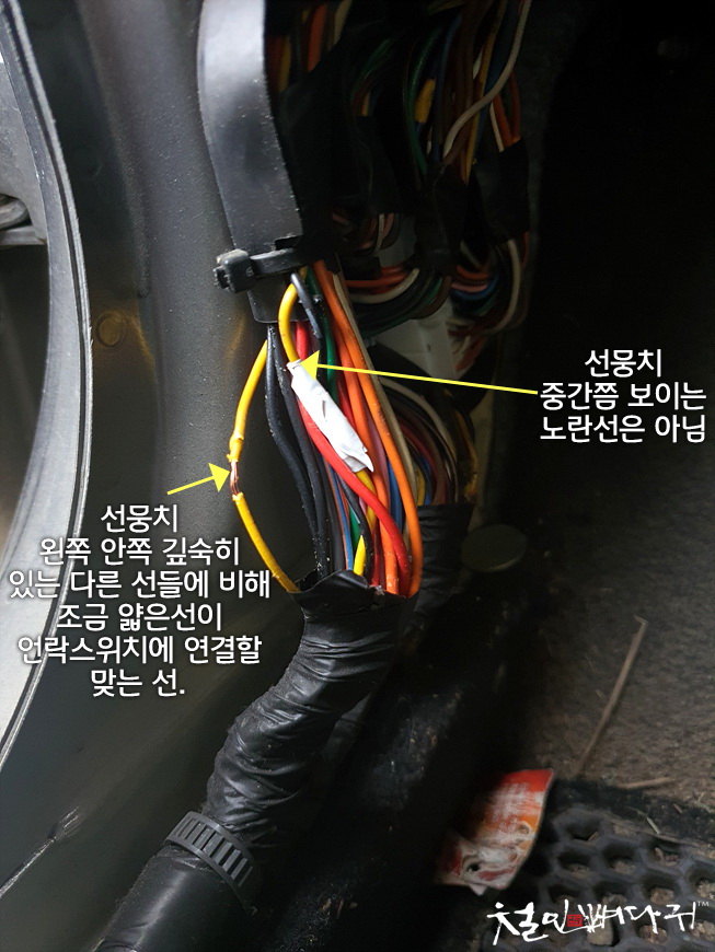 운전석의 왼쪽발 옆면 커버를 열면, 선뭉치가 있습니다.