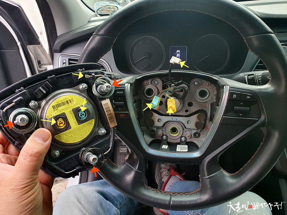 에어빽이 이탈되면, 에어빽에 고정되어 있는 3개의 커넥터를 뽑아서 핸들과 완전히 이탈시킵니다.