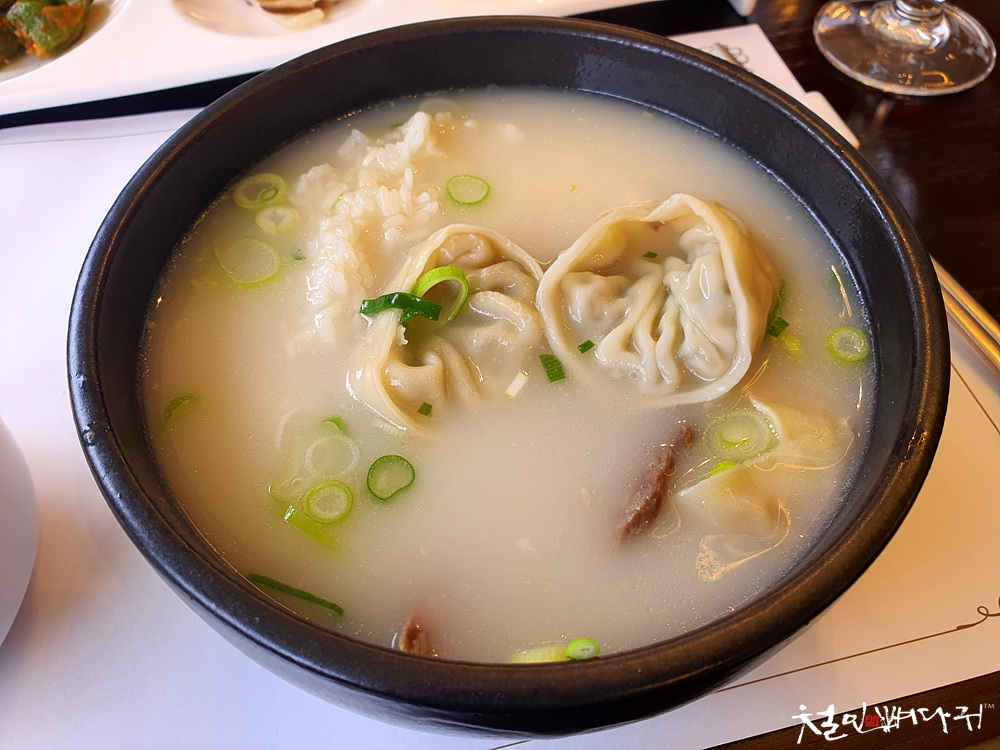 곰탕 같은 국물에 만두 5개 들어있습니다.