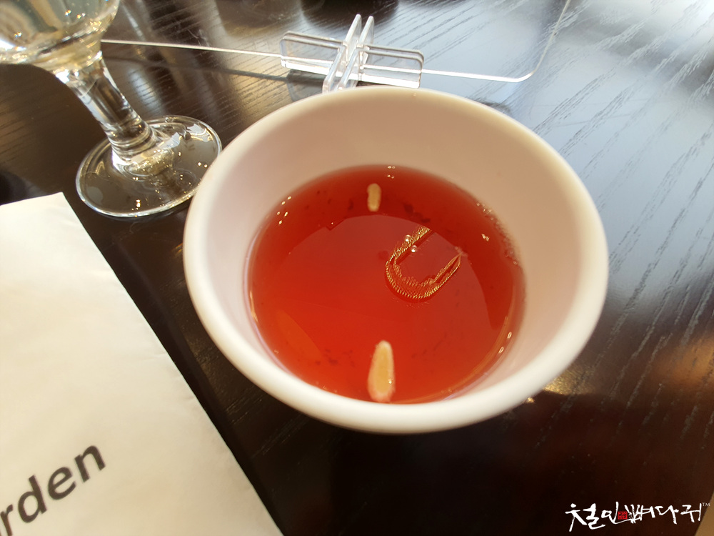 오미자차인 듯 한 새콤한 음료가 후식으로 미리 나와서 대기합니다.