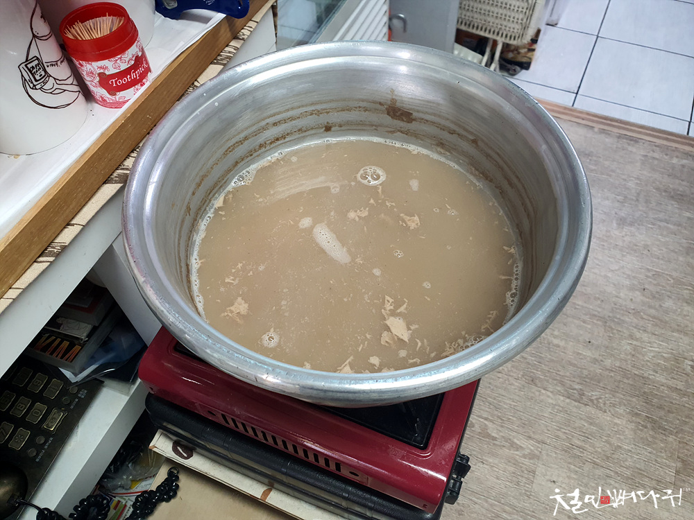 걸쭉한 농도의 숭늉이 부르스타 가스레인지 위에서 약하게 끓고 있습니다.