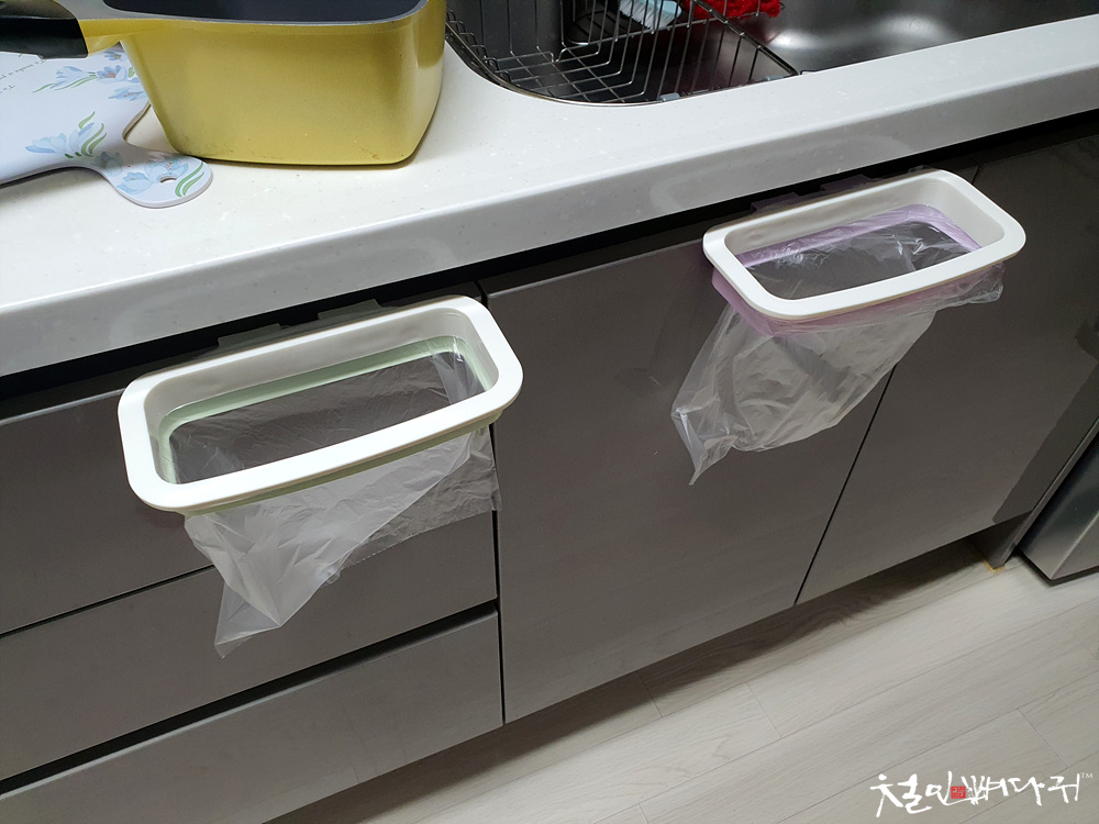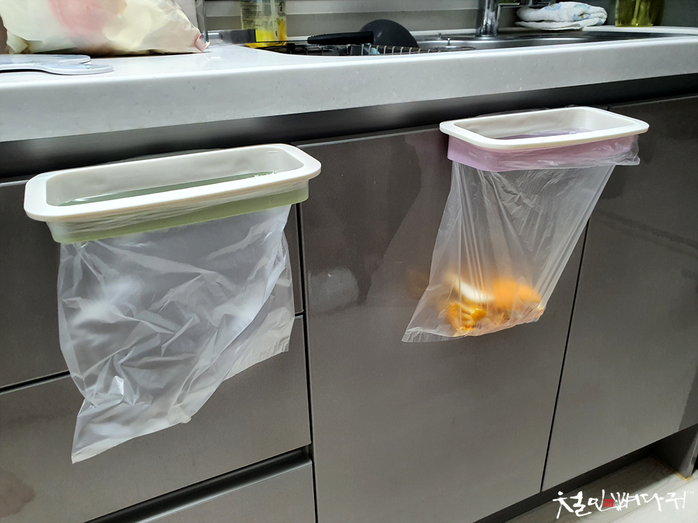 이전까지는 주방 싱크대 위에 비닐봉지 놔둔 상태로 쓰레기들을 모았었습니다.