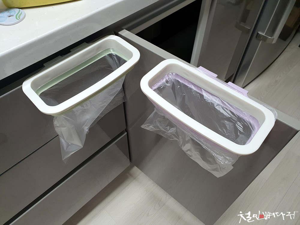 2개를 구입한 이유는 한쪽에 일반쓰레기, 다른 한쪽은 과일껍질 같은 음식물쓰레기로 구분하기 위함입니다.