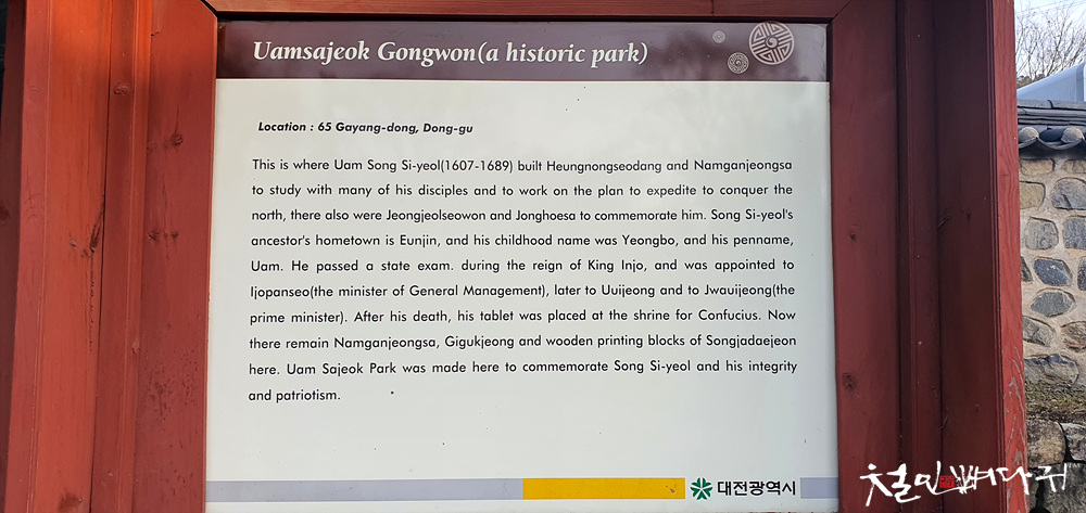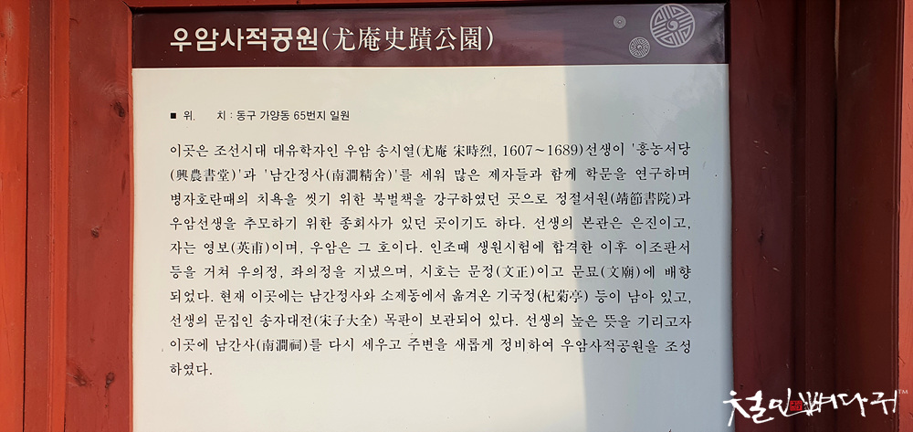 이 곳은 우암 송시열선생이 강학하시던 곳이다 선생은 흥농촌에 서재를 세워 능인암이라 하였고 숙종구년 능인암 아래에 남간정사를 지었다 선생은 이곳에서 많은 제자를 길러내는 한편 학문을 대성하였고 효종의 뜻을 받들어 병자호란때의 치욕을 씻고자 북벌을 계획하였다 선생의 도학과 절의 정신은 당대 뿐만 아니라 후학들의 귀감이 되었으며 선생이 수명하신후 후학들이 선생을 배향하였다 그후 종회사는 대원군때 훼철되고 일천구백삼십육년 사림과 후손이 남간사를 건립하여 우암 수암 석곡을 배향하고 제향을 받들어 왔다 나라를 되찾은 지 반세기 우리는 선생의 거룩한 정신을 배우며 제세안민의 도를 닦아야 함을 자각하게 되었다 따라서 대전시에서는 시민의 마음을 모아 이 유서깊은 곳에 선생의 높은 뜻을 기리고 후손들에게 우리의 전통문화를 배우고 익히며 그 맥을 이을 수 있는 명소로 보존코자 우암 사적공원 조성 계획을 수립 대역사를 착수하였다 여기에는 칠개년에 걸쳐 총 이만여명의 인력이 참여하였고 수많은 중기가 투입되었으며 공사는 오개업체(미림 풍산 동일 진강 도성)가 맡아 시공하였다 조성구역은 문화재보호 구역으로 지정된 일만육천평으로 그 중 일만여평은 매입하였고 오천여평은 종손 및 유회의 사용승낙을 받아 운평집에 수록된 내용을 토대로 문화재위원 사계학자등 각계권위자의 고증과 자문을 받아 서원건물팔동(남간사 이직당 심결재 견뢰재 명숙각 인함각 내삼문 외삼문)과 유물전시관 장판각등을 건립하였고 소나무 외 이십사종의 수목 일만삼천여본을 식재 조경공사를 완료하였다 이와 같은 사업은 일천구백구십일년 대전시에 의하여 계획 착공되었으며 그후 일천구백구십오년 칠월 일일 민선자치 시대를 맞이 하면서 본격적으로 추진되어 총공사비 일백십억원을 투입 일천구백구십칠년 십이월 삼십일일에 완공하였다 우암 사적공원이 우리 고유의 전통윤릴르 바탕으로 대전 정신을 창조하는 역사의 참교육장이 되리라 믿어 의심치 않는다 선생의 도는 천지와 더불어 영원할 것이며 이 사업 역시 선생의 도리와 더불어 영원하리라 일천구백구십팔년 무인 사월 십육일
