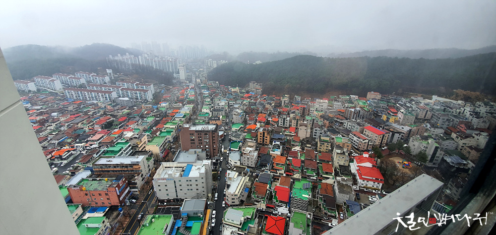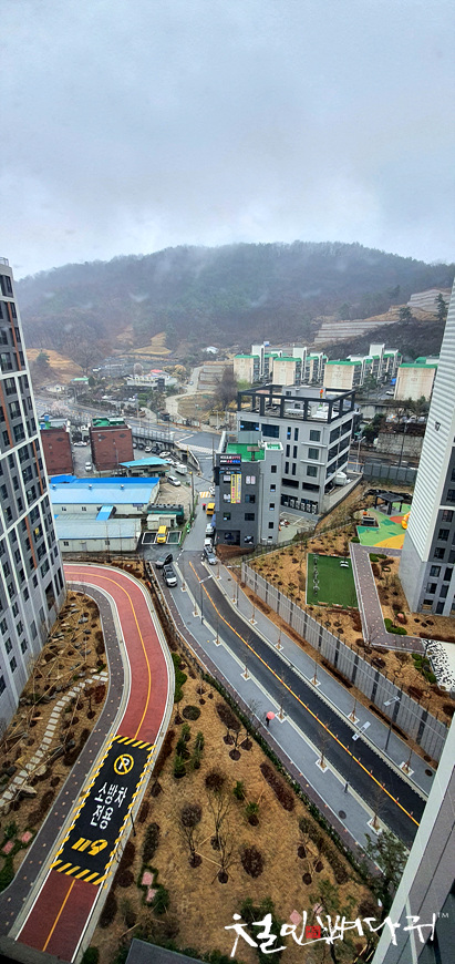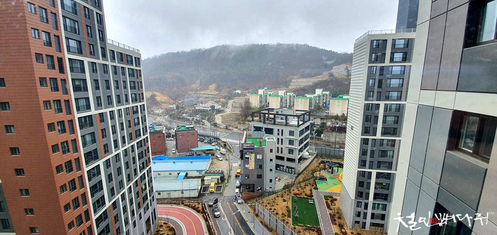 대전 동구 용운동의 e편한세상 대전에코포레아파트 106동 계단 쪽 창문에서 보이는 풍경입니다.