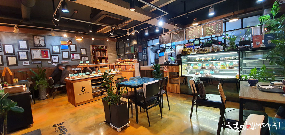 왼쪽에 테이블, 중앙왼쪽에 빵진열대, 오른쪽에 테이블
