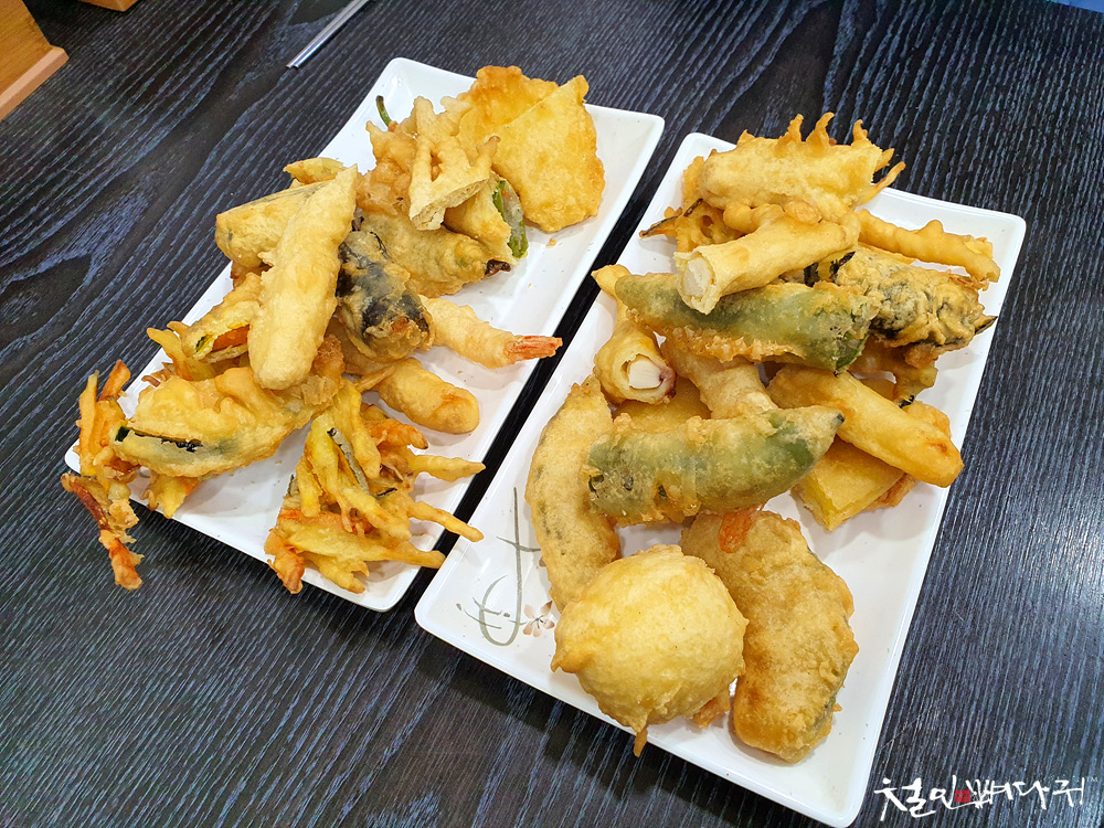 뭐에 홀린 듯 식당으로 들어갔고, 종류별로 튀김 달라고 주문했습니다.
