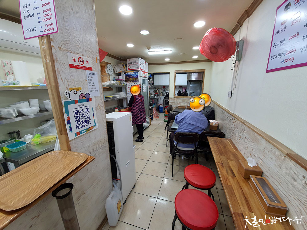 식당은 안쪽으로 긴 구조이고, 안쪽에 김밥 싸는 곳과 손님들의 테이블이 벽 쪽으로 마주 보고 있습니다.