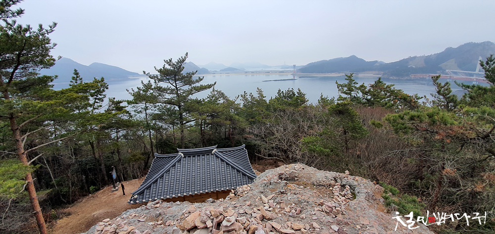 어화대 지붕이 보이면서 멀리 선유도가 보이는 풍경이 보이고,