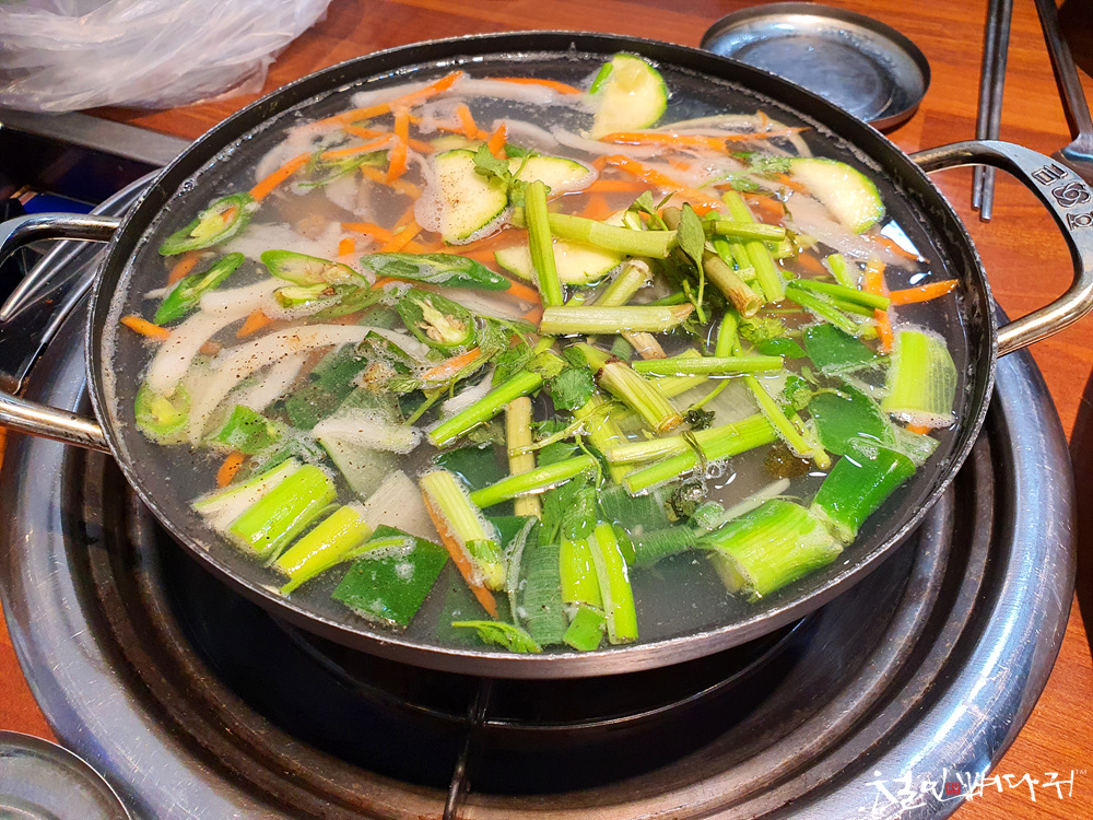 박대구이와 같이 먹으라고 나오는 바지락국물이 테이블 가스렌지에 올려지고, 끓여서 먹으면 됩니다. 그런데, 해감이 다 안되서 모래들이 조금 씹히는 것은 조금 아쉬운 부분이었습니다.